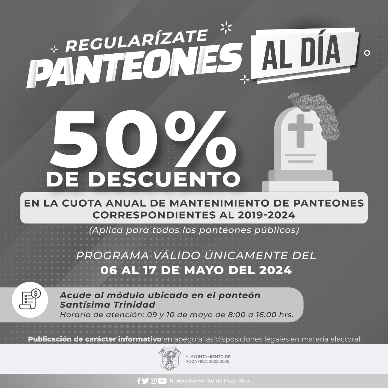 La oportunidad para regularizarse corresponde al pago de cuotas anuales de mantenimiento correspondientes del periodo 2019-2024, mismo que podrá realizarse en la Jefatura de Panteones, ubicada en el Palacio Administrativo del Ayuntamiento de Poza Rica, durante el horario de atención establecido de 8:00 a.m. a 2:00 p.m.