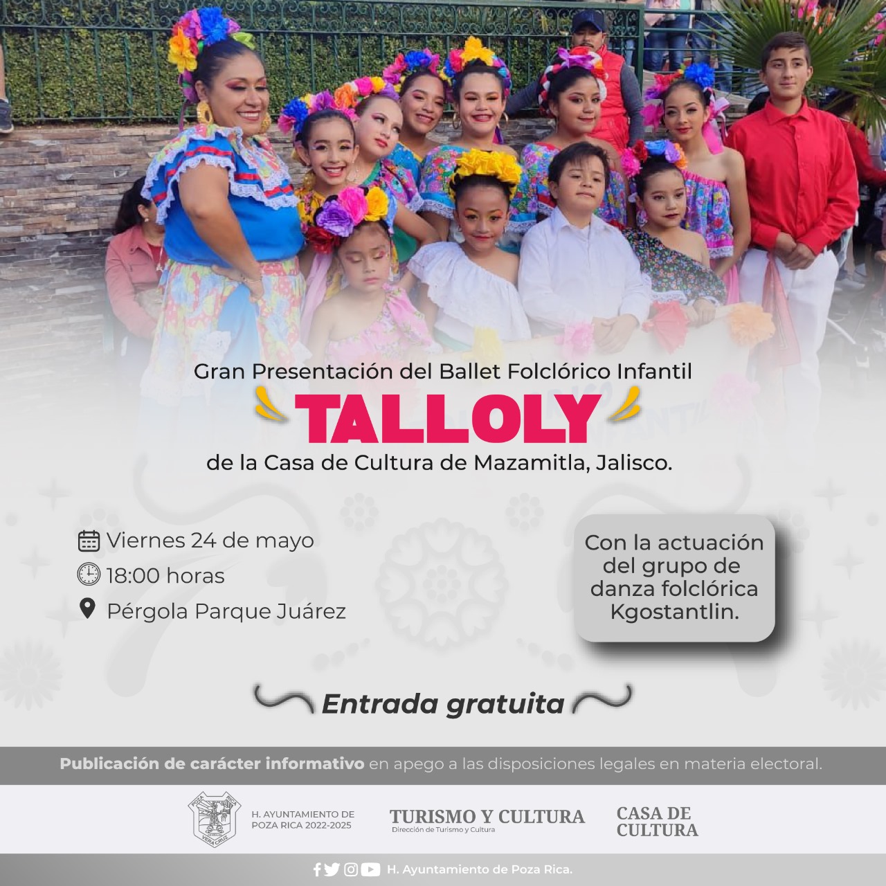 Poza Rica, Ver. – Este viernes, en punto de las 18:00 horas, la Pérgola del Parque Juárez será el escenario de una destacada muestra de expresión cultural y artística con la presentación del Ballet Folclórico Infantil Tlalloly, proveniente de la Casa de Cultura de Mazamitla, Jalisco.