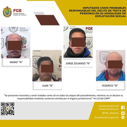 Jalacingo, Ver.-La Fiscalía General del Estado informa que, a través de la Fiscalía Especializada en Delitos de Violencia Contra la Familia, Mujeres, Niñas y Niños y Trata de Personas realizó imputación en contra de Juan “N”, Jorge Eduardo “N”, Mario “N” y Federico “N” como probables responsables del delito de trata de personas en su modalidad de explotación sexual, cometido en agravio de una adolescente de identidad resguardada.